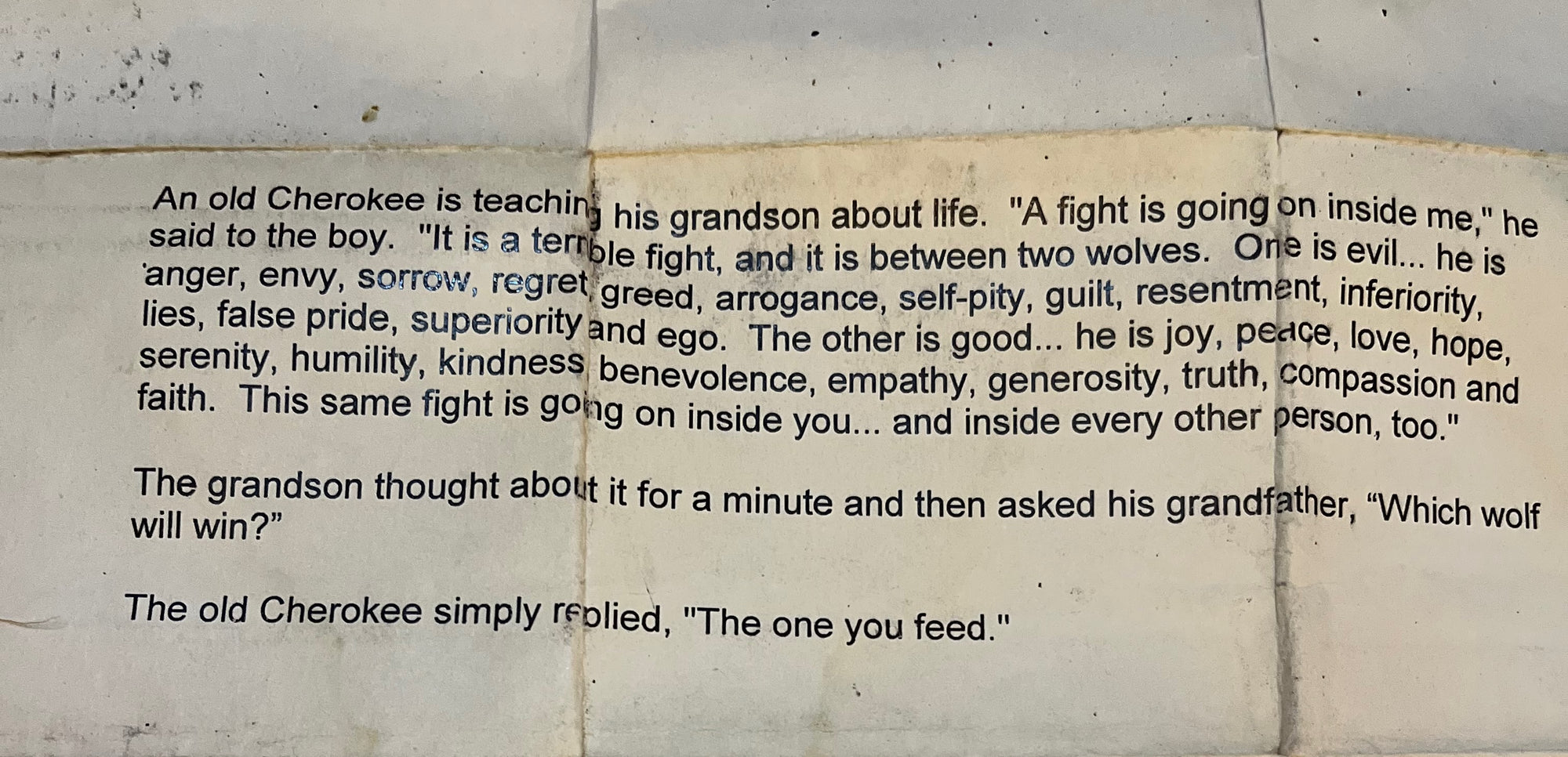 As he got out of the car, he reached into his wallet and pulled out a small, worn, folded card tucked behind his ID. Printed on it was The Two Wolves poem—a short story about the inner struggle between competing thoughts and values. He held it up, looked at me, and said, “I read this sometimes.”